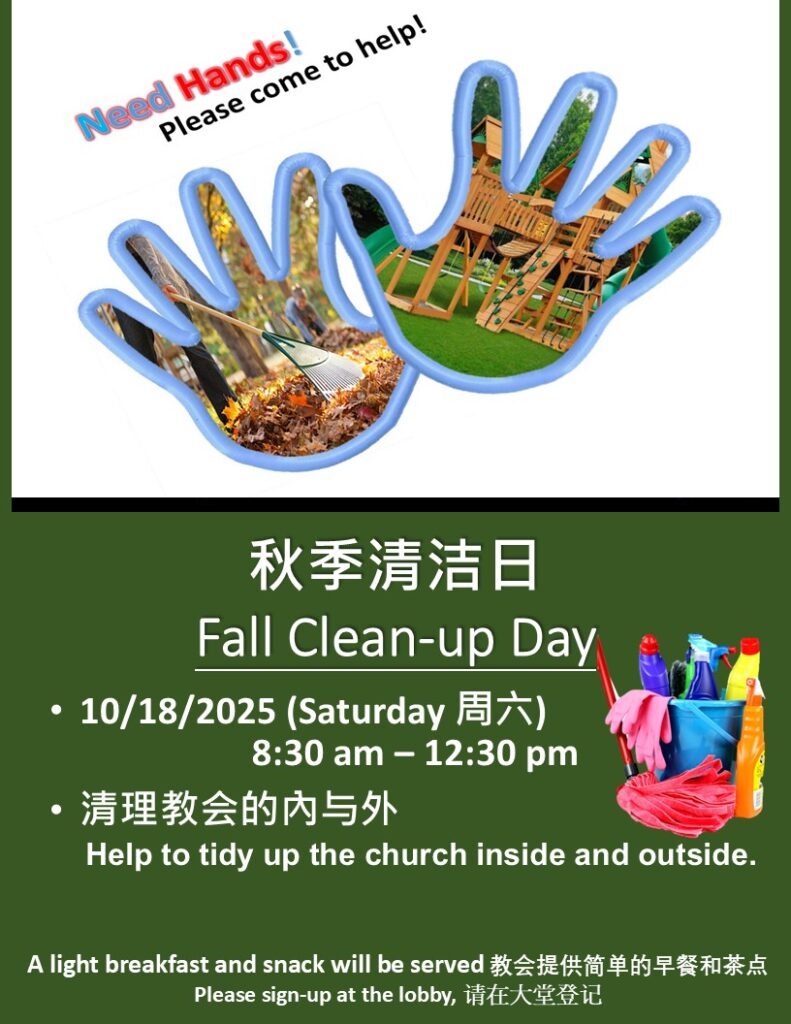 - 邀请所有人参与帮助整理教会的内与外。请在大堂登记,以便我们统计人数并安排相应的计划。 教会将提供简单的早餐和茶点。