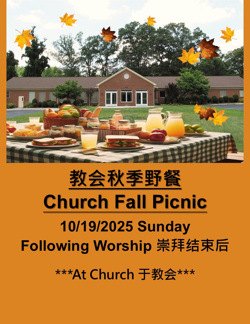 为了加强我们教会这个大家庭有更加亲密团契联系,,我们将在10月19日(星期日)崇拜结束及特別会员大会后于教会旁的树林小径举办教会年度秋季野餐!我们真诚地邀请大家留下来一齐分享这个有益于教会成员之间以及与新来的朋友建立关系的美好时光。