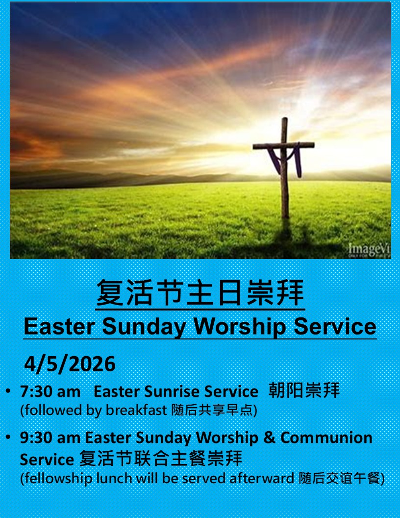 * 复活节主日联合礼拜 和圣餐 4/5,周日,上午 9:30, 崇拜结束后有团契午餐。